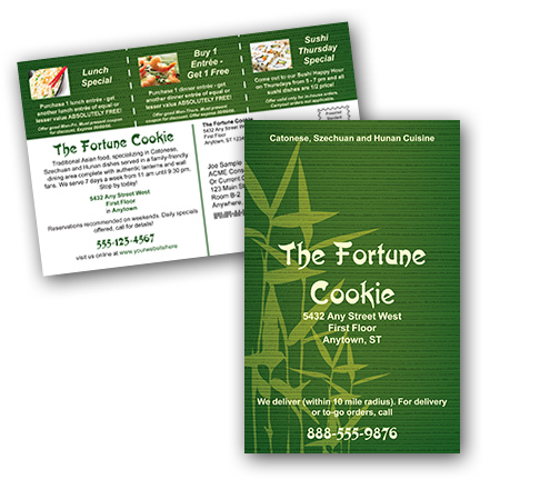 Description: Entice your clients' appetites with this Asian restaurant postcard featuring 3 areas for "coupon" specials. Bright green bamboo graphics add a feel of the Orient to this card. Select our large postcard (5.5" x 8.5") or small postcard (4.25" x 6").