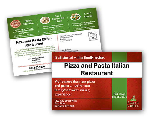 Description: Favoloso! This Italian restaurant postcard is perfect for reaching your clients, both new and current. Area provided to list 3 "coupon" specials as well as opportunity to upload your logo (if available). Select our large postcard (5.5" x 8.5") or small postcard (4.25" x 6").