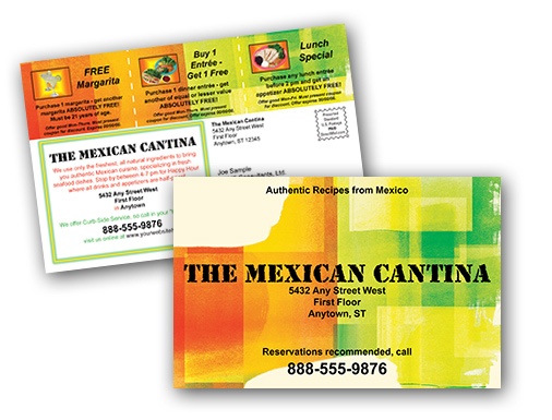 Description: ¡Magnífico! This brightly colored, festive postcard is perfect for advertising your restaurant. Card features three coupon areas (use stock photos or upload your own) and an area for general information. Select our large postcard (5.5" x 8.5") or small postcard (4.25" x 6").